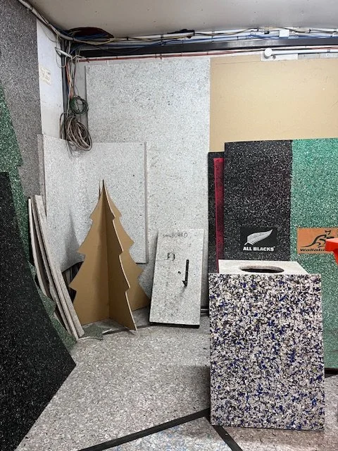 The materials are shredded and mixed to create the right ‘recipe’ for each production run. The material is compressed and heated to create boards with different thicknesses and between 2.4 – 3m in length. The edges are trimmed and all trimmings are recycled back through the process. A very thin film can be moulded onto the top of the board to change its colour, e.g. for the green boards use in Woolworths supermarkets.